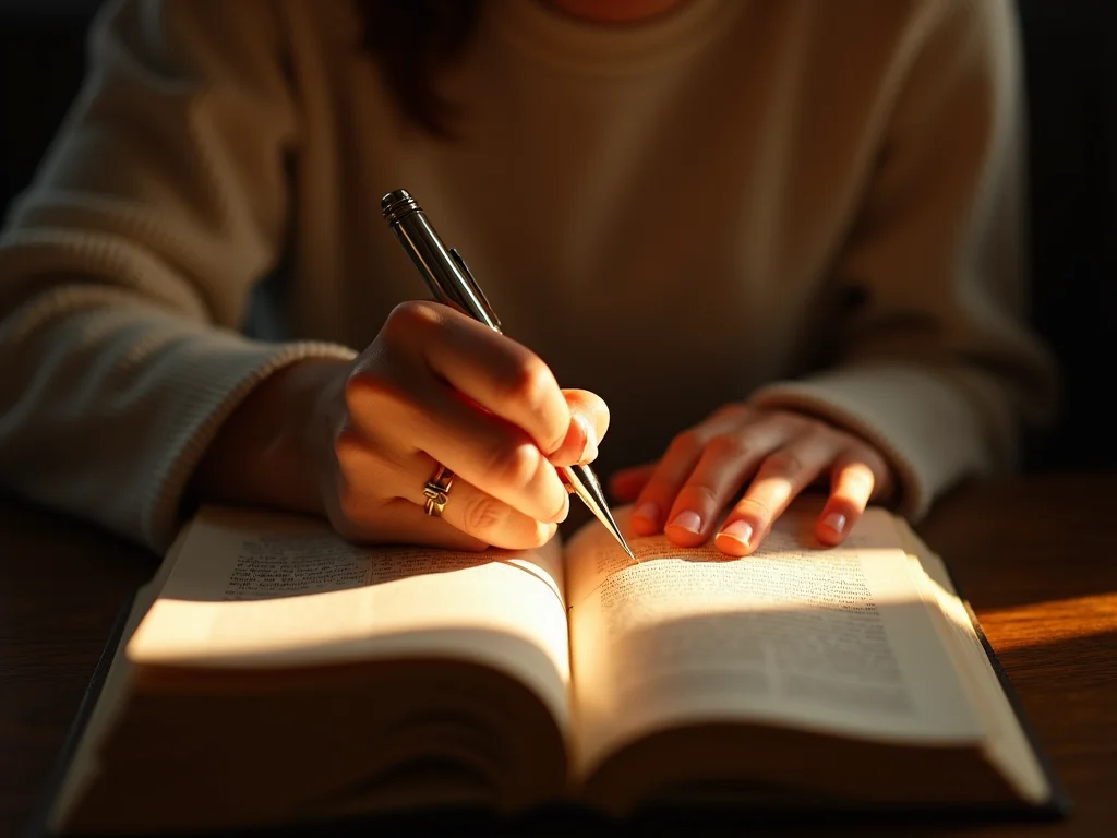 Close-up de uma mão escrevendo em um diário de gratidão com uma caneta rollerball preta, focando na ponta da caneta e no movimento da escrita.
